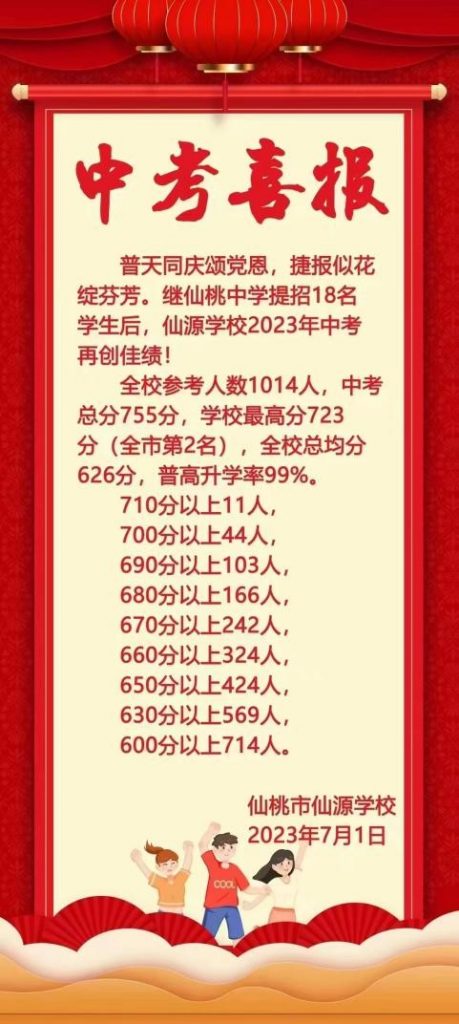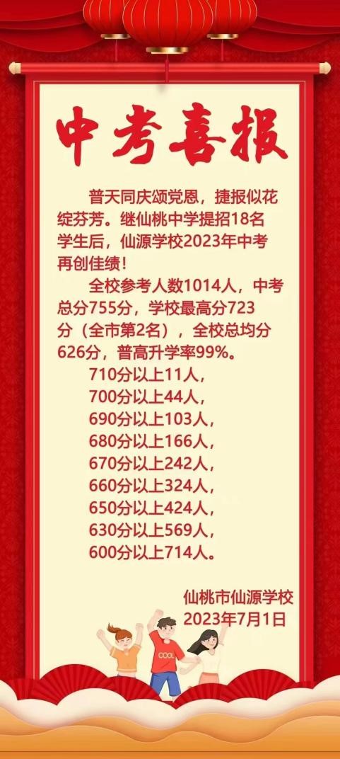 恭喜仙源學校在2023年中考中取得優(yōu)異的成績!全校參考人數(shù)1014人,中考總分755分,學校最高分723分(全市第2名),全??偩?26分,普高升學率99%!