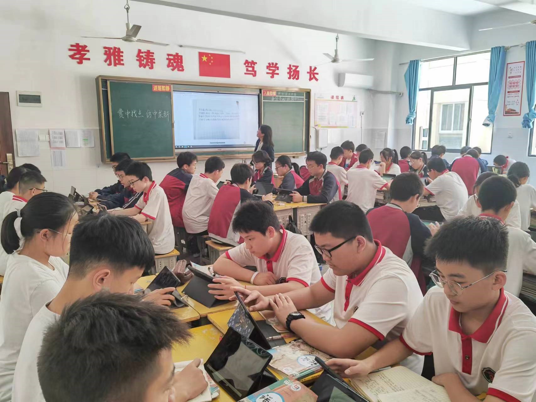 緊接著大家又跟隨著鐘偉校長參觀了初中學(xué)部校園,由初中學(xué)部張金洲校長全程陪同解說。在初中學(xué)部,嘉賓們真正體會到了什么是智慧終端的大規(guī)模常態(tài)化應(yīng)用,什么是信息技術(shù)與課堂教學(xué)的深度融合。無論走到哪個年級,推開哪個班級的教室,總是能夠看到智能終端應(yīng)用教學(xué)的場景,而非表演作秀。課堂上沒有教師的滿堂灌,學(xué)生被動聽的畫面,更多的學(xué)生自主學(xué)習(xí)、激烈討論、交流展示,教師以教練角色問題導(dǎo)學(xué),精講點撥的場景。信息技術(shù)已經(jīng)成為教師日常教學(xué)不可分割的一部分,深深觸動著嘉賓們的內(nèi)心。